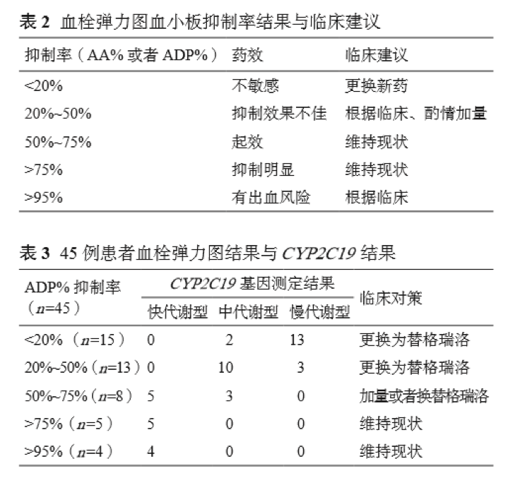 实验对45 例患者,选择高危患者或者慢代谢型的患者进行了血栓弹力图的结果确认。 在 45 例患者血栓弹力图中,ADP 抑制率不达标者 占 62.2%(28/45),显示了临床药师与临床医 师 应根据血栓弹力图与 CYP2C19 的基因测定相结合, 最终确定患者的个体化抗血小板治疗 方案。